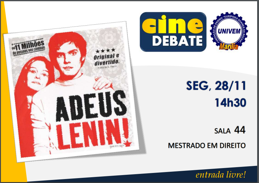 segunda-feira, dia 28, o projeto "Cine-debate", com exibição do filme "Adeus, Lênin!". O evento é aberto à comunidade, com debate sobre o assunto com o grupo de pesquisa do Mestrado.