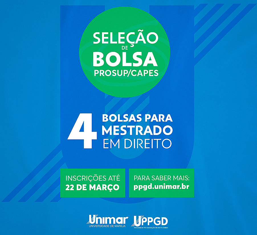 A Universidade de Marília (Unimar) divulgou edital de seleção para bolsas da Coordenação de Aperfeiçoamento de Pessoal de Nível Superior (Capes) destinadas ao Programa de Pós-graduação em Direito (PPGD). Estão sendo ofertadas quatro bolsas PROSUP/Capes. As inscrições vão até o dia 22 de março. Confira o edital: Edital Bolsas Capes Mestrado.