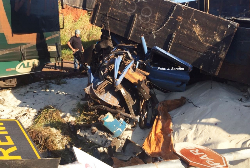 violentamente por um trem. O veículo ficou totalmente destruído e, no meio dos destroços, o motorista saiu andando, apenas com alguns ferimentos pelo corpo.