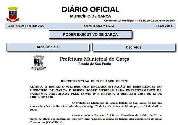 De acordo com nota divulgada pela assessoria de imprensa, o MP "alegou que as medidas adotadas em Garça precisavam manter as mesmas determinações dos decretos estaduais de calamidade pública e de quarentena declarada e estendida até o dia 10 de maio de 2020".