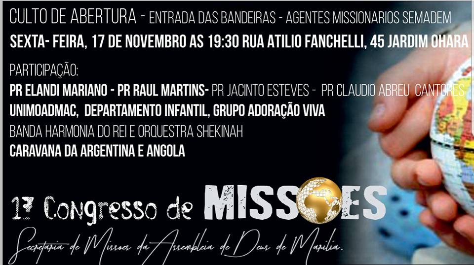 Começa nesta sexta-feira em Marília o 17º Congresso de Missões da Igreja Evangélica Assembleia de Deus de Marília. O evento será aberto logo mais às 19h, no
