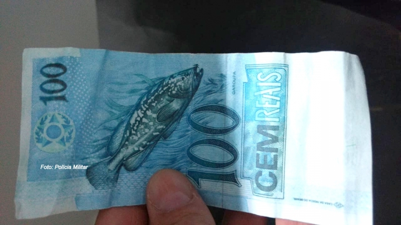 Com as características informadas, o homem foi localizado no interior de uma farmácia. Após abordagem e busca pessoal, os policiais encontraram no bolso frontal da calça, a cédula com características duvidosas.