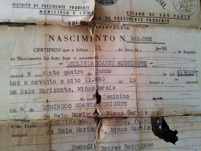 Conforme consta na Certidão de Nascimento, dona Deolinda Soares Rodrigues nasceu em 24 de junho de 1898, ou seja, ainda no século 19, em Belo Horizonte (MG). Ela conta que se casou e se mudou com o marido para o Estado do Paraná, onde trabalharam em roças. Quando o marido faleceu, com 40 anos de idade, a mulher voltou para Belo Horizonte com os filhos, mas depois se instalou em Presidente Prudente, onde vive até hoje.