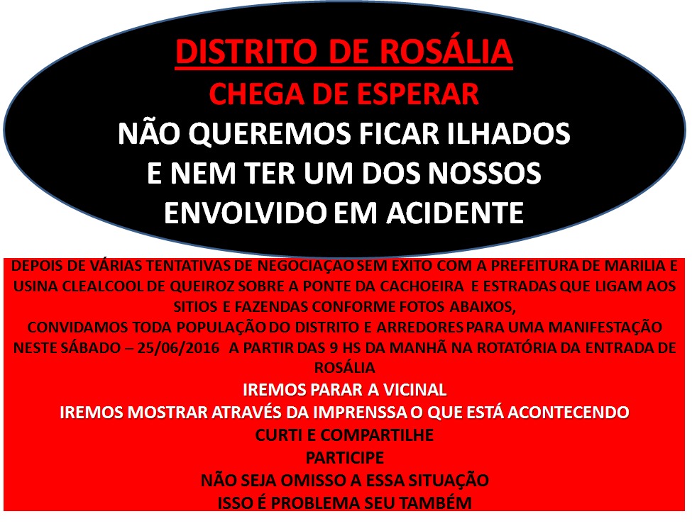 Preocupados com o risco de acidentes, já que o local é justamente numa ponte e interditou uma das pistas, os moradores de Rosália farão um protesto neste sábado