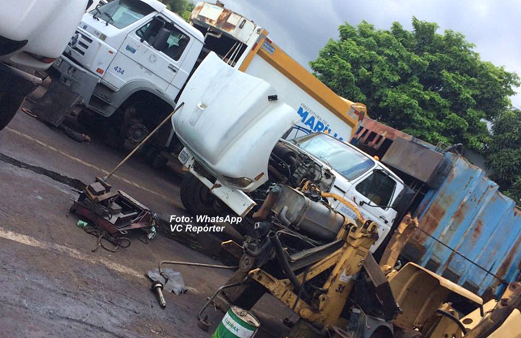 Caminhões de coleta de lixo quebrados na Garagem Municipal.