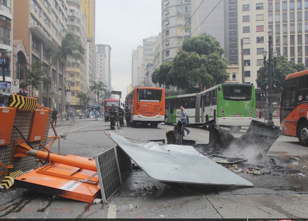 A tentativa de impedir a reintegração de posse do prédio do Hotel Aquarius, no Centro de São Paulo, terminou com um ônibus incendiado, ataque a loja, além de ao menos seis pessoas feridas e oito presas, segundo a Polícia Militar (PM). O tumulto parou o Centro da cidade.
