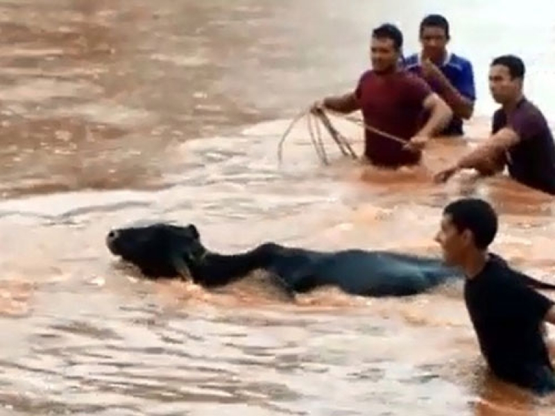 Moradores gravaram o resgate do animal. Nas imagens, cinco moradores entram na água e, com uma corda, resgatam o boi, que estava quase submerso . Os moradores conseguem chegar às margens em segurança e ninguém ficou ferido.