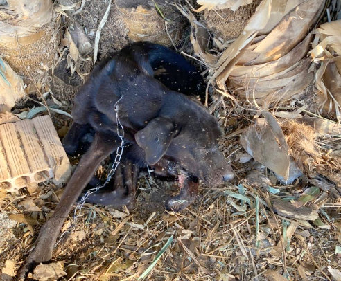 Após denúncia, o animal foi encontrado pela pela ONG Spaddes, em péssimas condições de saúde e em situação de maus-tratos. Ele estava amarrado em um bambuzal com uma corrente no pescoço, sem água e sem comida, muito magro, desnutrido e debilitado.