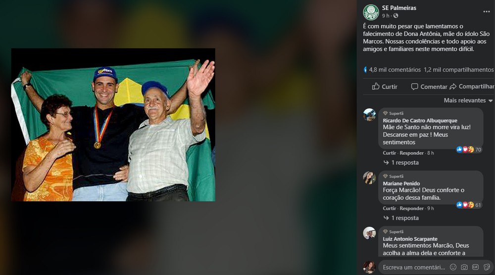 "É gente, perdi a maior parceira da minha vida, mas Deus me proporcionou 15 dias junto dela pra me despedir, fiquei junto com ela internado, rimos, choramos, assistimos o jogo do Verdão, comemos juntos, dormimos juntos, tive tempo de dizer o quanto eu a amava e ela de me dizer o mesmo, vai fazer muita falta mãe, a ti eu dedico tudo que fiz de bom nessa vida, descansa, a senhora merece!", diz o post.