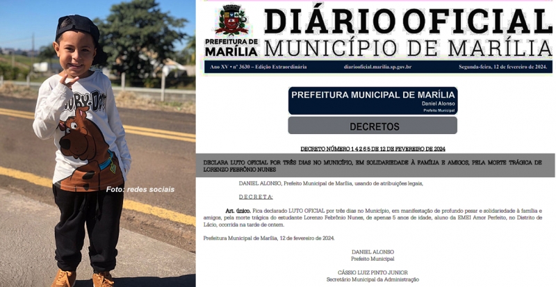 "O bárbaro crime chocou Marília e deixou toda a cidade em profunda comoção", justificou o prefeito Daniel Alonso ao assinar o decreto. Lorenzo estudava numa escola municipal no distrito de Lácio, onde morava, desapareceu e foi encontrado morto a pedradas.