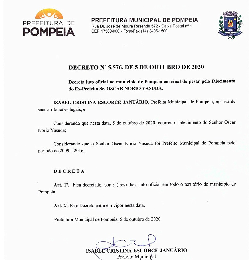 A prefeita de Pompeia, Tina Januário, decretou há pouco luto oficial no município por 3 dias pela morte do ex-prefeito, Oscar Yassuda. Ele faleceu nesta tarde, vítima de um câncer que tratava há dois anos.