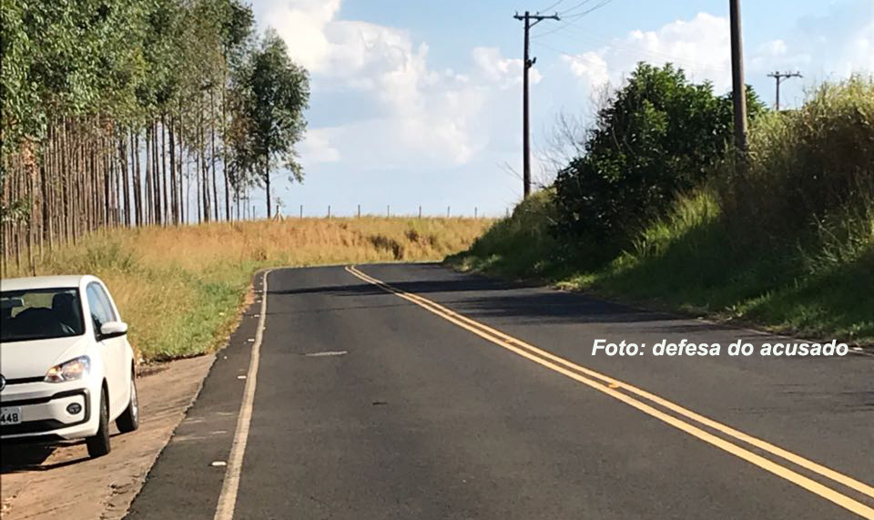 Ari relata que na estrada vicinal foi surpreendido com o carro do acusado do acidente (um UP, placas de Marília) que fazia zigue-zague na pista.
