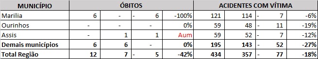 De acordo com os novos dados do Infosiga SP, a região de Marília teve queda de 42% em mortes no trânsito na comparação entre os meses de janeiro de 2021 e 2022. Foram apontadas 12 ocorrências fatais no ano passado contra sete no primeiro mês deste ano. Em todo o Estado a redução foi de 10%.
