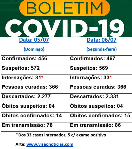 De acordo com o boletim epidemiológico desta segunda-feira, foram confirmados mais 11 casos de Covid-19 (agora são 467), além de 366 pessoas curadas, 86 em período de transmissão (dez a mais que ontem); e 33 internadas (dessas, cinco com exame positivo).