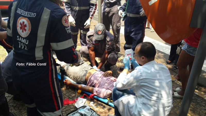 Um motociclista sofreu graves ferimentos num acidente há pouco bem no centro da cidade. Foi uma colisão que se envolveu com um carro. Segundo o Corpo de Bombeiros, após o choque a vítima foi jogada contra um poste de iluminação.