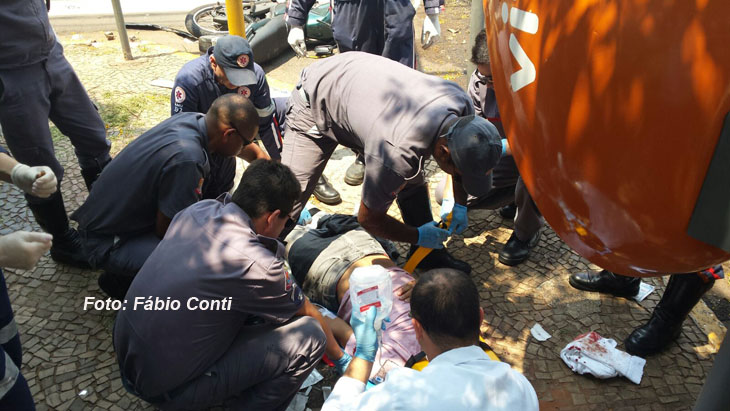 A moto envolvida no acidente e a vítima durante atendimento de emergência no próprio local do acidente.