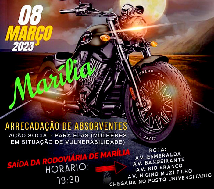 Dezenas de motociclistas de Marília e região devem se reunir nesata quarta-feira, dia 8 de março (Dia Internacional da Mulher) para um evento social que visa ajudar mulheres em situação de vulnerabilidade, com arrecadação de pacotes de absorventes. Será o 2° passeio noturno de motos que vai percorrer as principais avenidas da cidade.