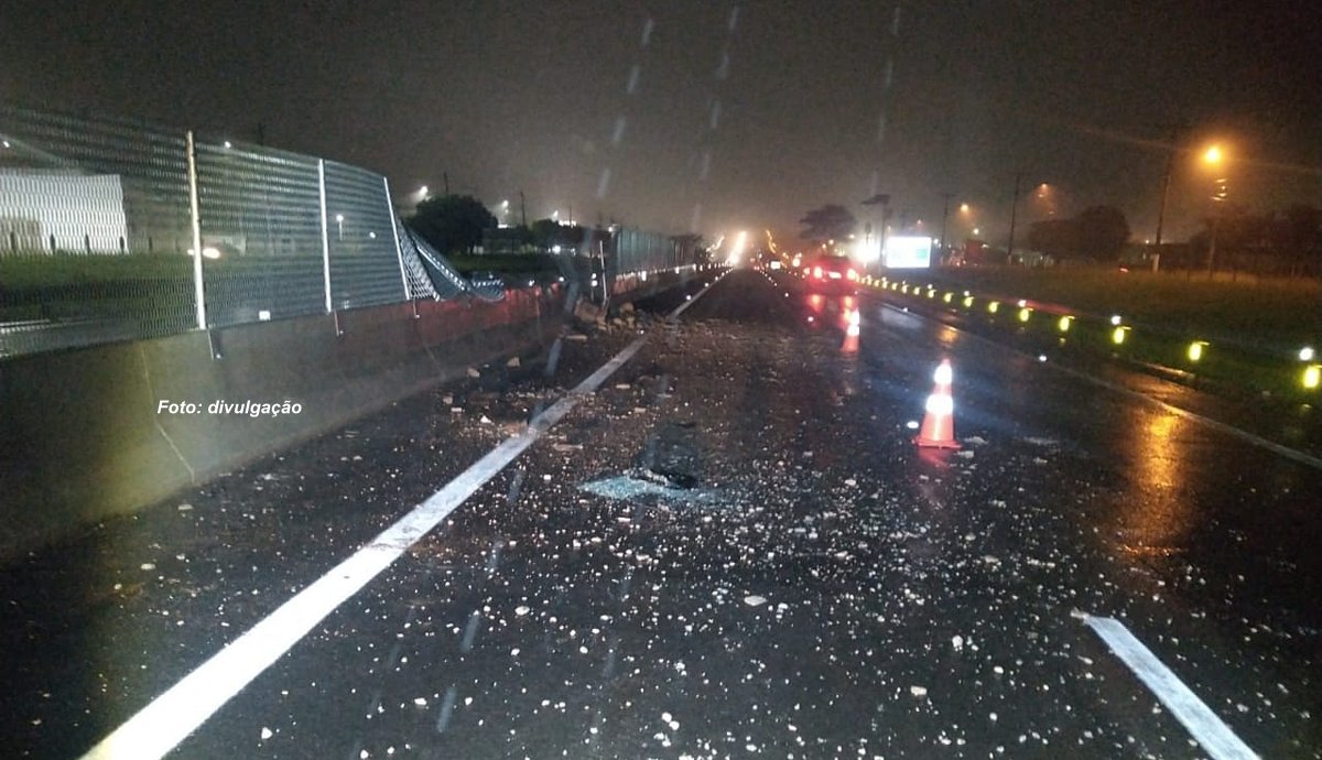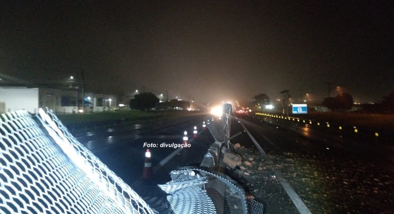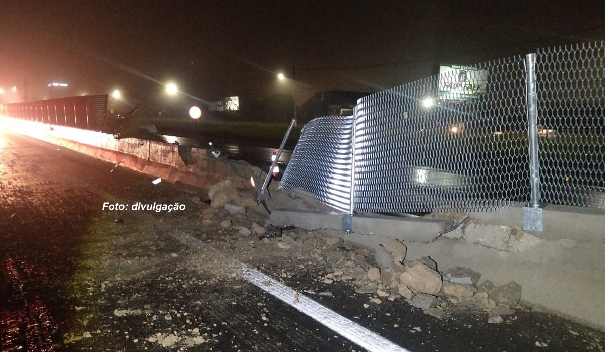 O condutor da caminhonete, que vinha logo atrás, não conseguiu desviar, bateu na traseira e em seguida perdeu o controle. O veículo chocou-se contra a mureta de concreto, que divide as pistas, e ainda destruiu parte do alambrado que foi instalado no local quando da instalação da passarela.