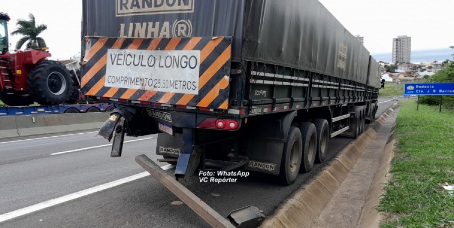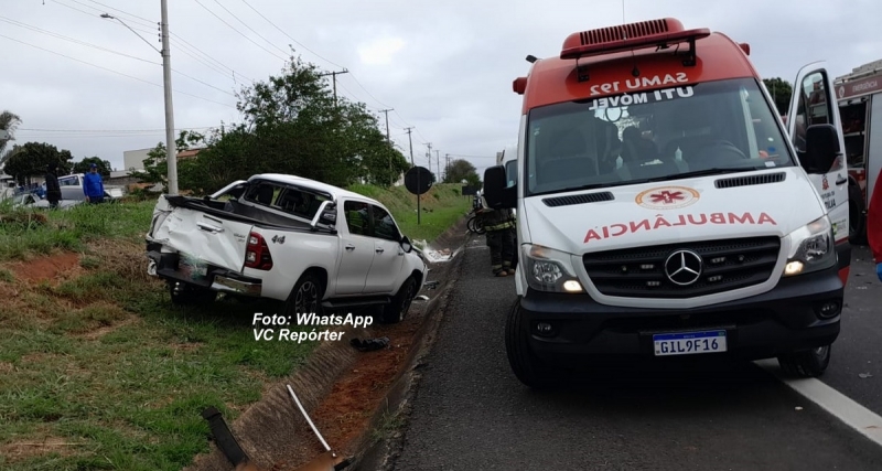 Após bater na caminhonete, que chegou a capotar e parar além do acostamento, um caminhão pequeno, carregado com blocos (de uma empresa de Marília) acabou batendo na traseira da carreta.