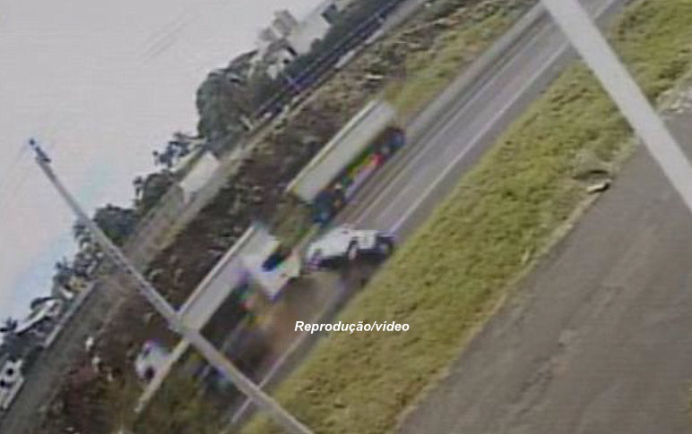 Nas imagens é possível ver o veículo Gol, que estava ultrapassando a carreta, parando na pista e, após a batida, segue até ao acostamento, mais adiante.