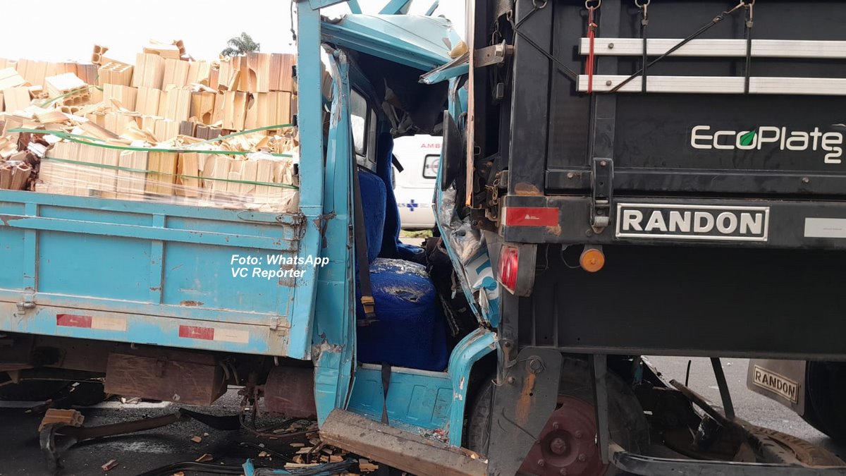 Como ficou a cabine do caminhão, onde estavam as duas vítimas, após bater na traseira da carreta.