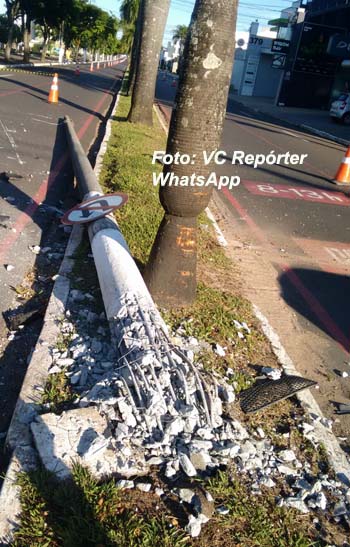 Com o impacto, o poste ficou destruído