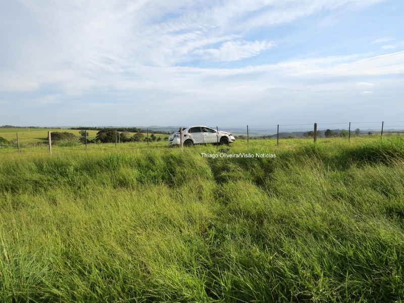 A Polícia Rodoviária Estadual e uma equipe do DER removeram o carro de dentro da fazenda com o auxílio de um trator.