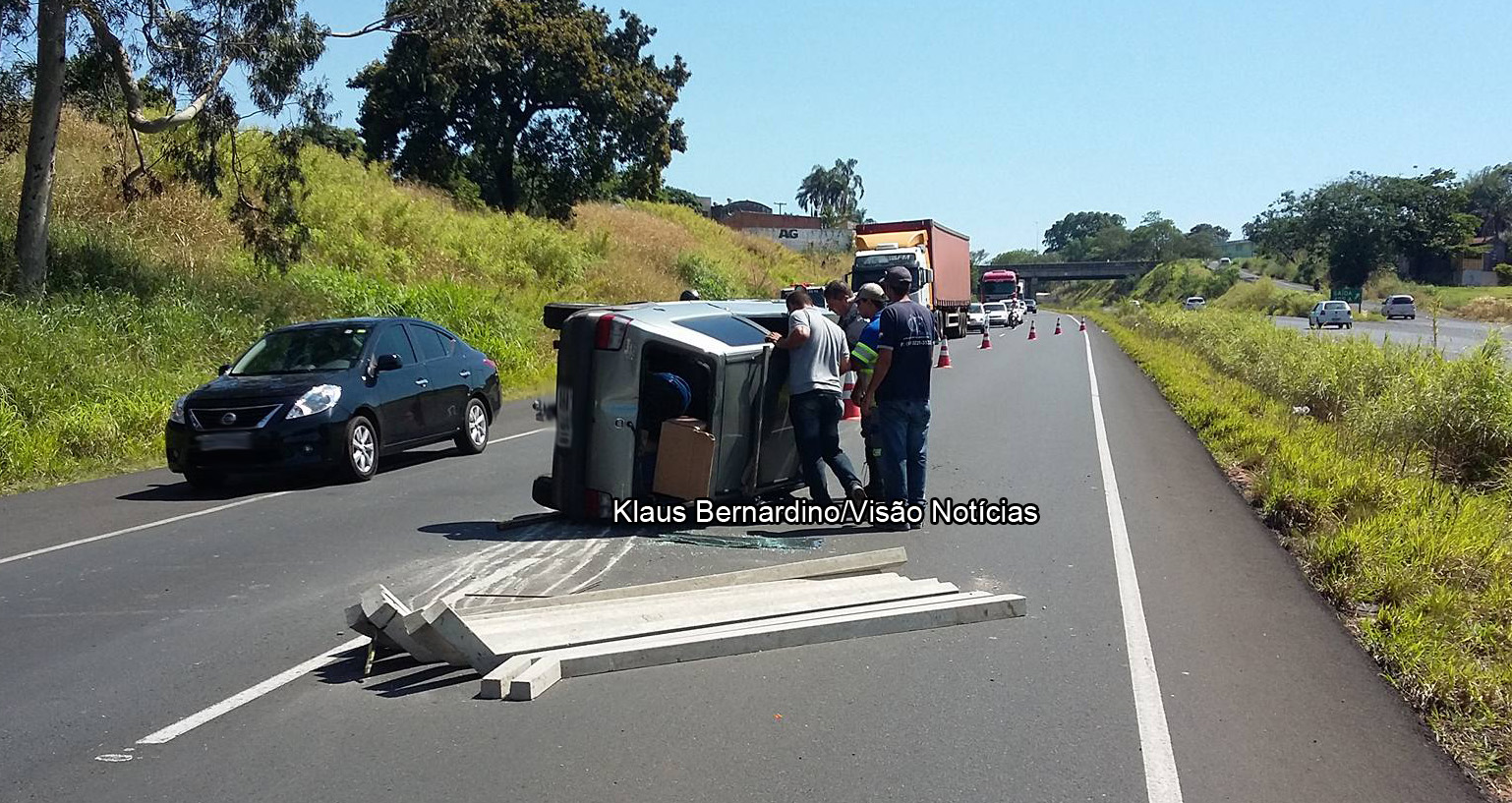 Um Fiat Uno seguia pela via com uma carretinha acoplada em sua traseira, transportando pilastras de concreto. Segundo o motorista, em dado momento a carga começou a balançar e ele perdeu o controle do veículo, que acabou tombando na via. As pilastras ficaram espalhadas pelo asfalto, interditando o trânsito até a chegada da Polícia Rodoviária.