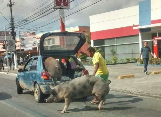 "Ele já vinha com a mala entreaberta e os porcos dentro. Mas os animais caíram e ele parou pra colocar os bichos de volta no carro. Nessa hora, eu parei para fotografar", conta o internauta Kléverton Amorim.