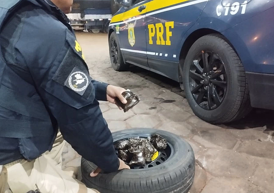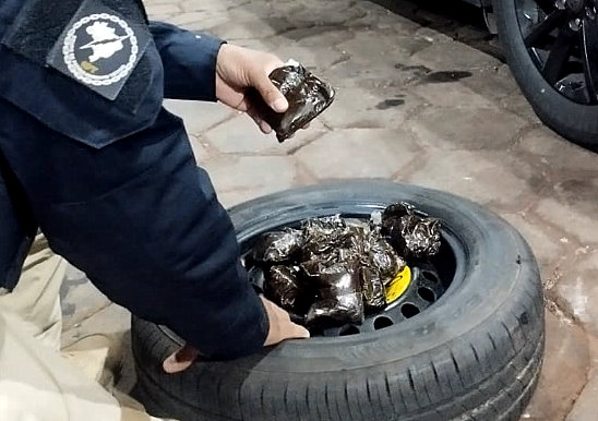 Diante disso, foi feita uma vistoria no automóvel, sendo encontrado dentro do pneu estepe um pacote de haxixe (foto), embalado em saco plástico, pesando cerca de 3,5 kg. Ele foi preso em flagrante e encaminhado à Central de Polícia Judiciária de Ourinhos, onde ficou à disposição da justiça.