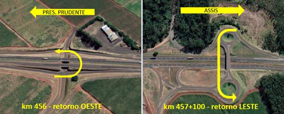 O motorista deverá redobrar a atenção para as alternativas de conversão do sentido. O retorno para a pista Oeste (sentido Presidente Prudente), poderá ser feito pelo dispositivo localizado no km 456. Já a mudança para a pista Leste (sentido Bauru) será direcionada para o km 467+100.