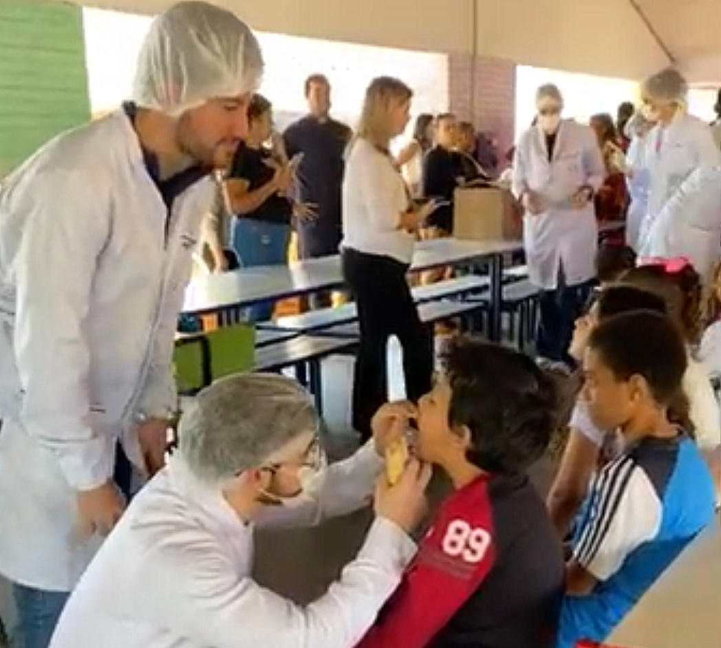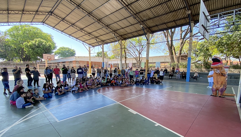 A primeira atividade foi realizada com as crianças da Escola Estadual Professor Antônio Gomes de Oliveira. Acompanhadas de seus pais ou responsáveis, as crianças participaram de teatro de fantoches, destacando a importância da escovação.