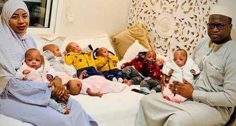 Halima Cissé, de 26 anos, deu à luz nove crianças, no Marrocos. A jovem contou que ela e o pai dos bebês, Kader, de 35 anos, acreditavam que eram sétuplos, e se assustaram com a vinda de mais duas crianças.