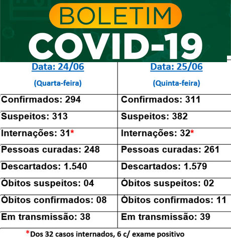 Pelos novos números, nas últimas 24 horas foram confirmados 17 novos casos de Covid-19 na cidade, passando para 311 positivos; sendo que desse total 261 já estão curados e 39 em período de transmissão (ainda com o vírus), além de 32 pessoas internadas.