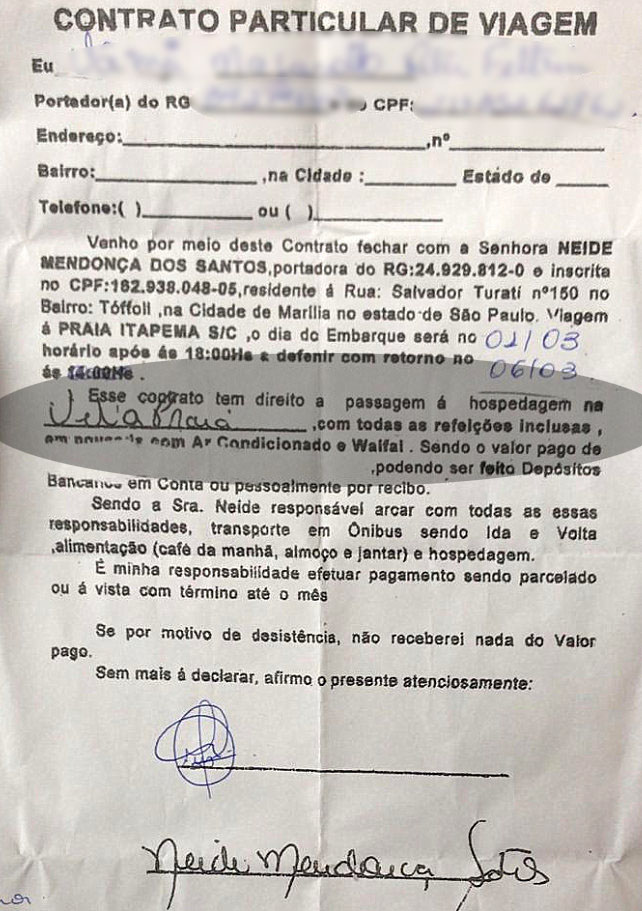 De acordo com as vítimas, a excursão vinha sendo organizada desde setembro do ano passado. Muitas pessoas pagaram a vista (R$ 700,00 e R$ 350,00 no caso de crianças) para passar cinco dias em Itapema (litoral de SC) numa pousada, com direito a três refeições e hospedagem. Muita gente chegou a pagar a vista esse valor.