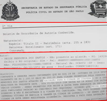 Boletim de ocorrência registrado na CPJ.Mas, depois disso a organizadora da excursão simplesmente não atende mais às ligações e nem mensagens.