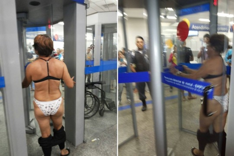 Uma mulher foi barrada pelo detector de metais em uma agência bancária de Cabo Frio, na Região dos Lagos do Rio, e resolveu tirar a roupa e mesmo despida, não conseguiu passar pela porta de vidro.