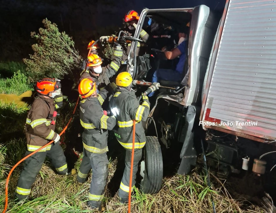 Trabalho dos Bombeiros para retirar motorista do caminhão preso nas ferragens.