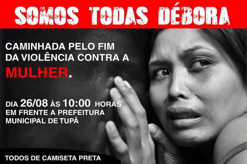 Pedindo por Justiça e chamando a atenção para a violência contra a mulher, centenas de pessoas pretendem realizar neste sábado (26), em Tupã, uma passeata denominada "Somos Todas Débora". A concentração está prevista para às 10h, em frente ao Paço Municipal, na Praça da Bandeira.