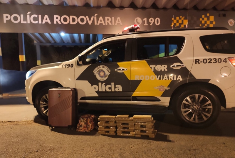 Durante patrulhamento nos pátios de um posto de combustível, os policiais encontraram duas malas abandonadas e em seu interior 44 tabletes de maconha, pesando 29.848 quilos da droga.