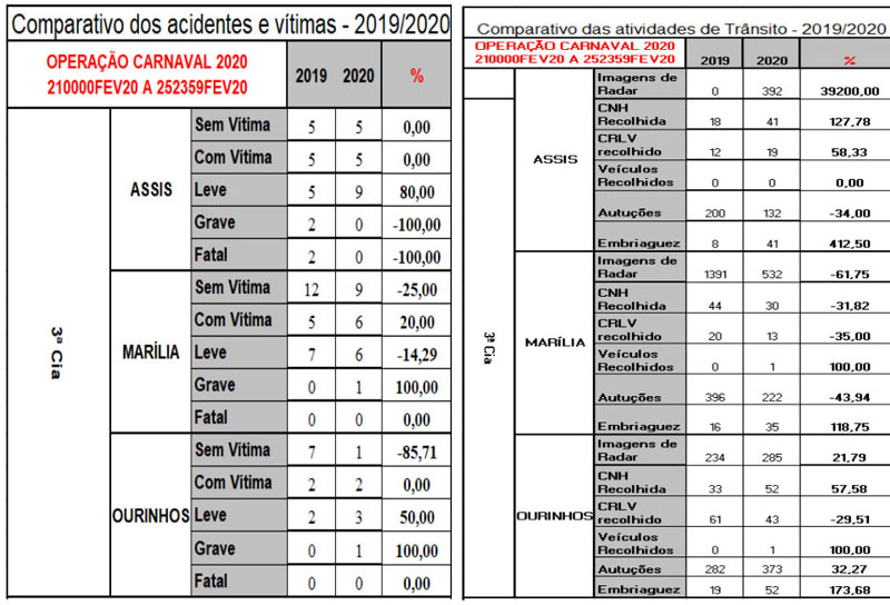 A Polícia Rodoviária Estadual divulgou no final da tarde desta quarta-feira um balanço da Operação Carnaval realizada nos 54 municípios das regiões de Assis, Marília e Ourinhos.