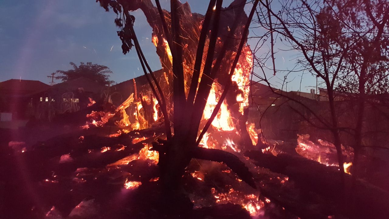 A antiga seringueira pegou fogo e foram necessárias cinco horas para controlar as chamas