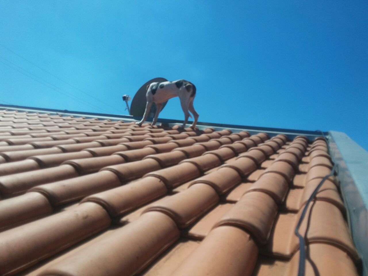 A cadelinha foi parar em cima do telhado.