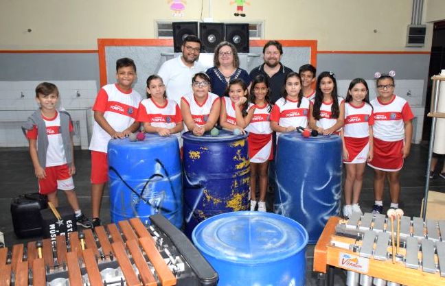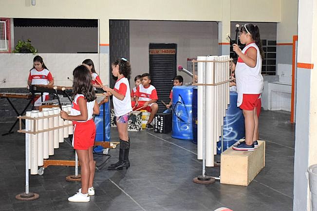 Na EMEF “Grupão”, cerca de 200 alunos do 1º ao 3º ano do ensino fundamental têm aulas de música todas as segundas-feiras. Com o sucesso das aulas, no início do ano passado surgiu o projeto de extensão ‘Esse Som É PVC’, com aulas e ensaios no contraturno escolar. Nesta segunda (15), uma banda de 12 alunos, regida pelo professor Augusto Botelho Campos fez sua primeira apresentação para pais e responsáveis.