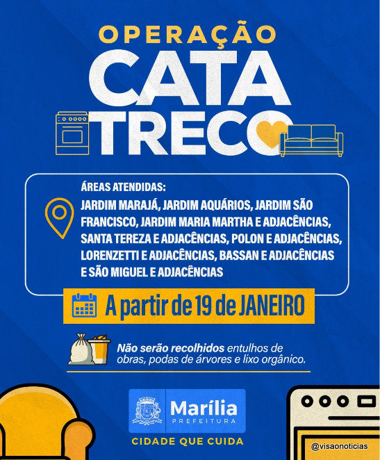 A Secretaria Municipal do Meio Ambiente e Serviços Públicos de Marília, inicia nesta segunda-feira (dia 19), uma nova etapa da do mutirão de limpeza denominado "operação Cata Treco", com atendimento nos bairros Marajá, Aquárius, São Francisco, Maria Martha, Santa Tereza, Polon, Lorenzetti, Bassan e São Miguel – localizados na zona Oeste da cidade.