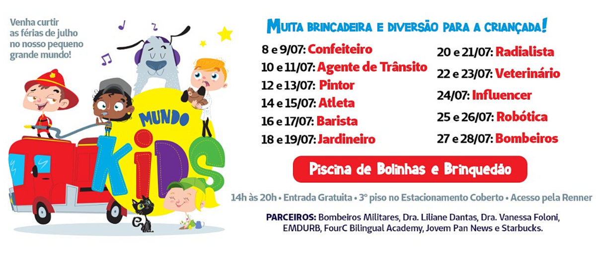 A diversão da garotada de toda região está garantida no Bauru Shopping. A partir desta segunda-feira (08) até o dia 28 de julho, o ponto de encontro nas férias escolares é o Mundo Kids. Neste ano, as oficinas abordam o universo das profissões.