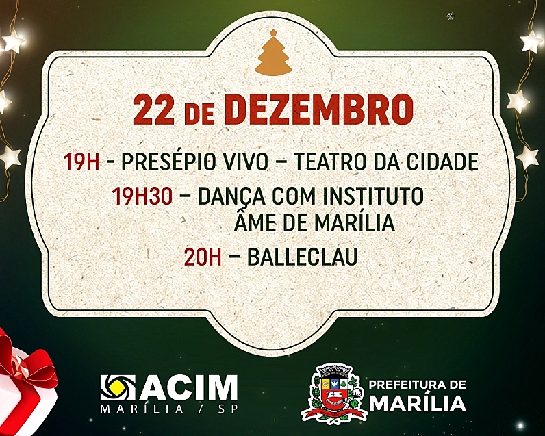 Nesta semana o evento contará com apresentação do Presépio Vivo do Projeto Teatro da Cidade, além dos bailarinos do Instituto Âme de Marília e BalleClau premiados pela Lei Aldir Blanc, por meio de Edital desenvolvido pela Secretaria da Cultura.
