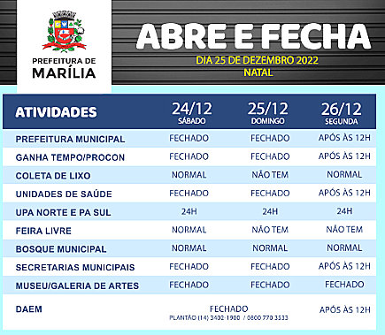 Em Marília, por exemplo, a Prefeitura informou que a coleta de lixo e também as feiras livres estarão suspensas apenas no dia de Natal, mas neste sábado (dia 24) e segunda (26) o funcionamento será normal (em relação a coleta). Não há feira livre na segunda.