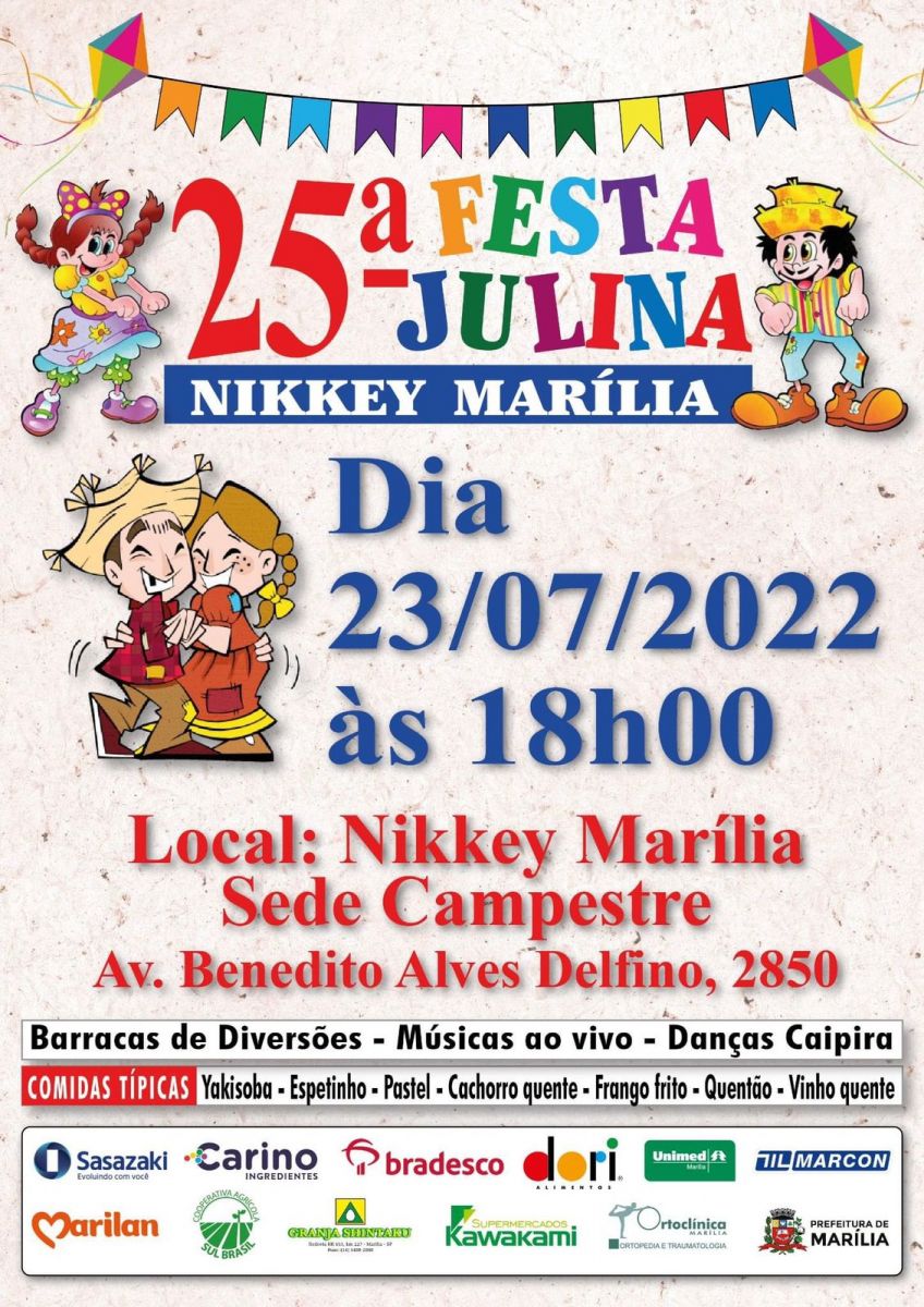 O Departamento de Jovens do Nikkey Marília realiza neste sábado (dia 23) o tradicional “Arraiá do Nikkey Marília”, em sua 25ª edição. Com entrada franca e sem cobrança de estacionamento, o evento terá uma série de atrações ao público, incluindo a tradicional gastronomia.