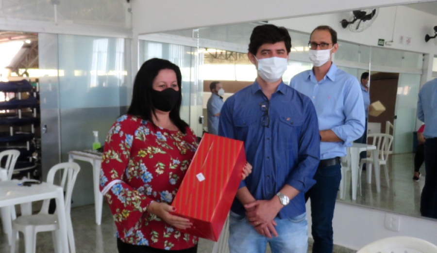Roberta faz a entrega de um dos brindes durante a solenidade de entrega dos contratos.